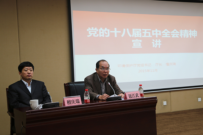 自治區(qū)環(huán)境保護(hù)廳廳長檀慶瑞作宣講,自治區(qū)國資委副主任、黨委副書記、巡視員聶江武主持宣講會(huì)。