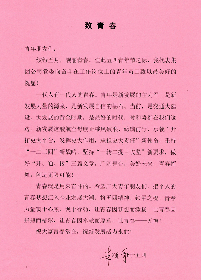 朱堅(jiān)和書記傳達(dá)了習(xí)近平總書記在中國政法大學(xué)的重要講話精神,并宣讀了致青年朋友們的一封信——《致青春》,向奮斗在工作崗位上的廣大青年員工傳達(dá)了殷切期望與美好祝愿。信件原文如下: