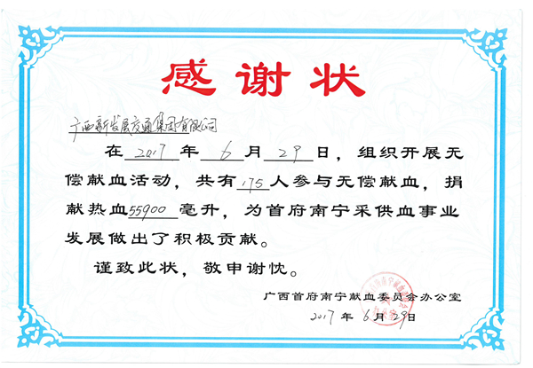 南寧獻(xiàn)血管理委員會(huì)充分肯定了新發(fā)展交通集團(tuán)黨員群眾踴躍參與獻(xiàn)血,積極投身公益事業(yè)的行為,并向集團(tuán)公司贈(zèng)送了感謝狀。
