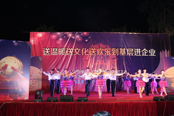 晚上,自治區(qū)總工會安排了豐富多彩的慰問演出。整場演出以“勞動托起中國夢”為主題,載歌載舞,奏響勞動光榮的時代主旋律。慰問演出在富有壯族文化風(fēng)情的《廣西尼的呀》的舞蹈中拉開了序幕,既有《力與美》的高難度雜技表演,又有詼諧幽默、勵志感人的小品《為愛加油》,配樂詩朗誦《心儀廣西》展示了廣西壯鄉(xiāng)的山好水好前景闊,更有優(yōu)美的舞蹈《魅影》、《工匠精神》等節(jié)目更是歌頌了勞動之美。路橋集團員工還帶來配樂詩朗誦《萬里征程品為本,行穩(wěn)致遠前景闊》和小品《工地愛情故事》,展現(xiàn)了路橋職工的風(fēng)采。慰問演出在歌舞《不忘初心》中畫上了圓滿的句號,路橋建設(shè)者們在這場文化盛宴中度過一個難忘的夜晚。