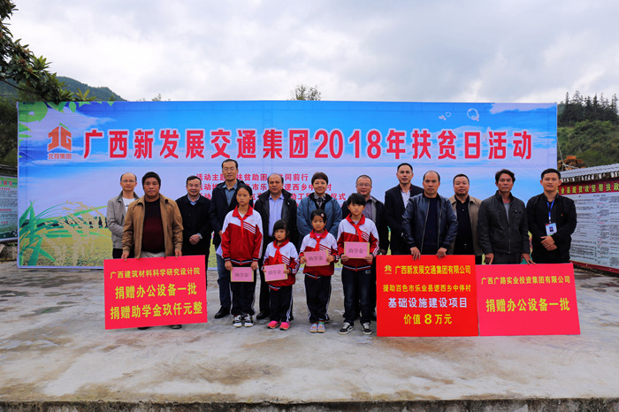 2018年10月17日是我國第5個扶貧日,按照自治區(qū)統(tǒng)一部署,新發(fā)展交通集團以“扶貧助困 共同前行”為主題,深入環(huán)江縣、樂業(yè)縣、合山市5個扶貧聯(lián)系村開展走訪慰問、基礎(chǔ)設(shè)施建設(shè)及產(chǎn)業(yè)項目援助、金秋助學(xué)、志愿聯(lián)建等活動。