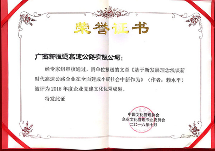 會上,由賴水平撰寫的文章《基于新發(fā)展理念淺談新時代高速公路企業(yè)在全面建成小康社會中新作為》在企業(yè)黨建文化優(yōu)秀成果評比中,被評為2018年度企業(yè)黨建文化優(yōu)秀成果;由新恒通公司都巴指揮部創(chuàng)作團隊拍攝的《遷動人心》微電影榮獲“最美企業(yè)之聲”代言作品榮譽稱號。