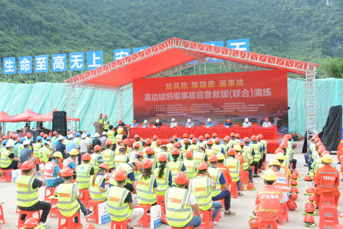 作為“防風險 除隱患 遏事故”主題“安全生產月”活動內容之一,該演練結合融水至河池高速公路項目施工中存在的高邊坡坍塌重大危險源的特點,旨在加強參建人員安全防范意識,提高安全應急處置、救援能力。