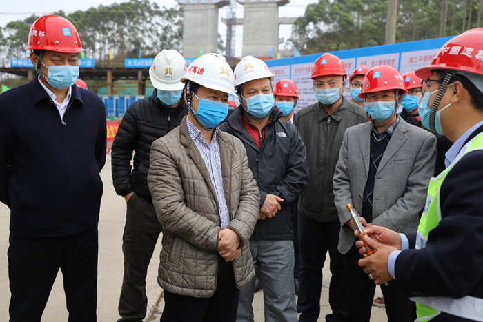 3月5日,自治區(qū)交通運(yùn)輸廳副廳長(zhǎng)王劼耘到大塘至浦北高速公路項(xiàng)目開(kāi)展防疫及復(fù)工復(fù)產(chǎn)工作情況調(diào)研。自治區(qū)交通工程質(zhì)量安全監(jiān)督站站長(zhǎng)陳津維、自治區(qū)高速公路發(fā)展中心主任周北、欽州市政府副秘書(shū)長(zhǎng)黃立和一同調(diào)研。