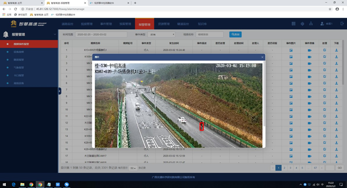 此前,工作人員對路面進行安全排查只能通過監(jiān)控巡查和人工巡查兩種方式,花費的時間長、成本高,發(fā)現(xiàn)問題的速度慢。如今,安裝了人工智能事件檢測報警系統(tǒng),一旦有行人或動物進入到高速路上、車輛不規(guī)則行駛或者路面出現(xiàn)拋灑物、垃圾等障礙物,監(jiān)控中心智慧高速平臺上便會自動彈出檢測報警視頻和圖片。該系統(tǒng)不僅能提升巡查效率,減輕巡檢人員的壓力,還能讓監(jiān)控員迅速掌握路況信息,從而根據(jù)事跡情況做出相應(yīng)的響應(yīng)。